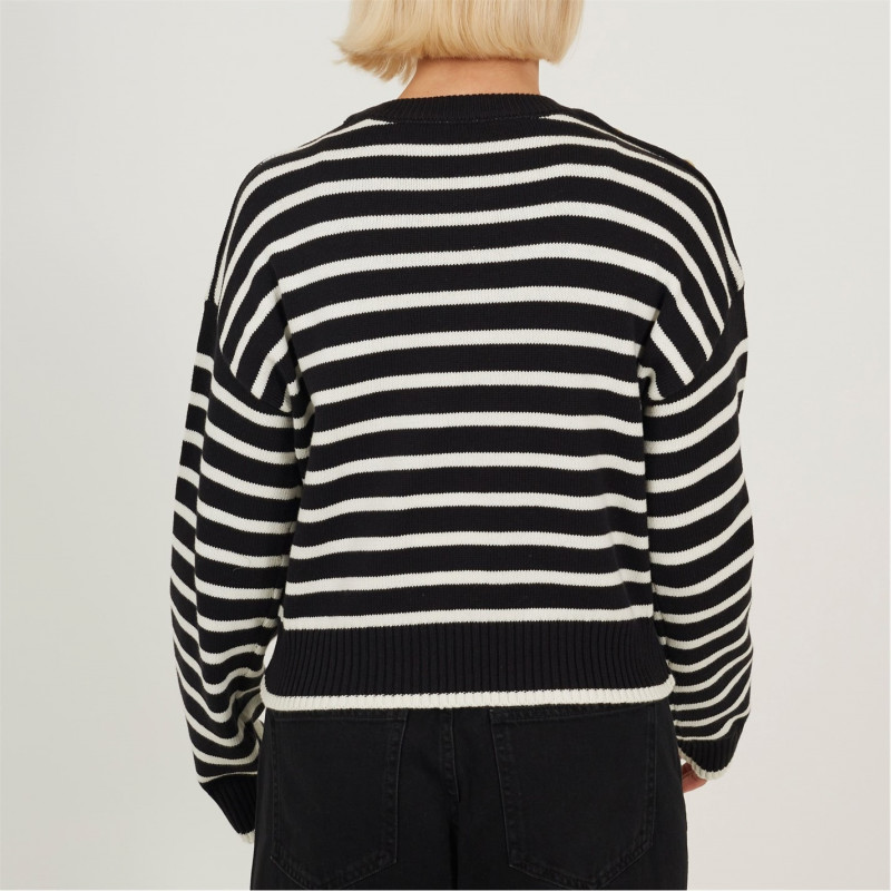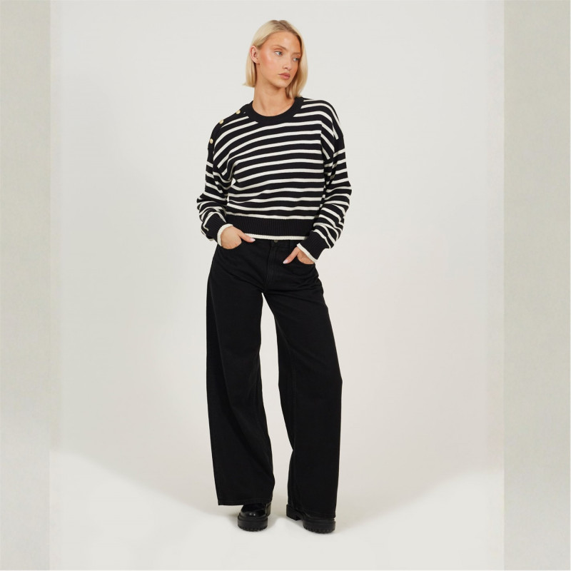 Brave Soul Boxy Crew Neck Striped Jumper With Shoulder Button Detail Black/Ivory -