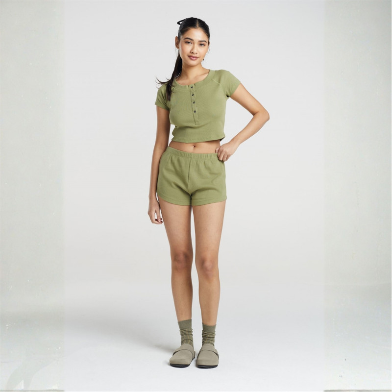 Brave Soul Womens Lounge Set With Henley Cropped Tee & Matching Shorts Khaki -